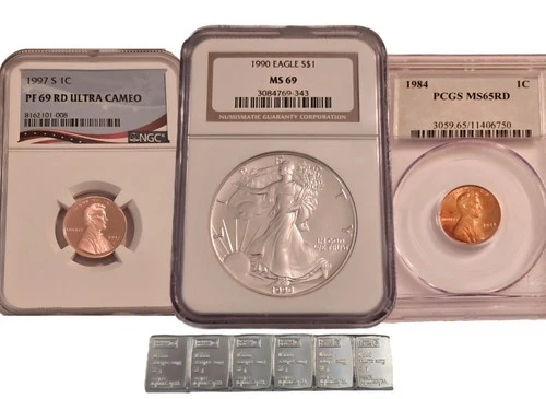 - LOT- (6) 1g Valcambi Silver Bars, 1oz. 1990 American Silver Eagle NGC MS 691997 NGC PF69 RD Ultra Cameo/1984 PCGS MS65RD$113.507 bids · Time left3m left (Today 12:27 PM)Free deliveryLocated in United Statesatc24_2006 100% positive (849)