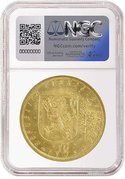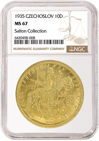 Das Top-Los der Auktion ist eine Tschechoslovakei 10 Dukaten aus dem Jahr 1935, die mit NGC MS 67 bewertet wurde und auf die Sammlung Salton zurückgeht (Los 480). Der Startpreis liegt bei 30.000 € (etwa 31.000 $). Diese osteuropäische Goldrarität wurde während der Ersten Tschechoslowakischen Republik ausgegeben, die von 1918 bis 1938 dauerte. Die Vorderseite zeigt den Schutzpatron des tschechischen Staates, den heiligen Wenzel, auf einem Pferd, das ein Schwert hält. Auf der Rückseite ist ein tschechischer Löwe mit einem slowakischen Schild auf der Brust und einem Lindenzweig auf der rechten Seite zu sehen. Nur 34 Exemplare dieser Münze sind in der NGC-Zählung aufgeführt, und diese Münze ist zusammen mit zwei weiteren die am höchsten bewertete.