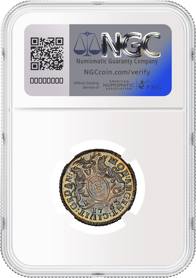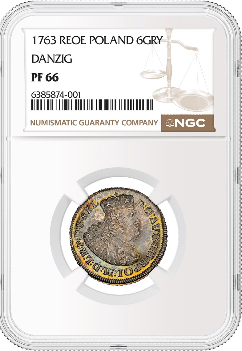 Ebenfalls angeboten wird ein Polen (1763 REOE) 6 Groszy, Danzig, bewertet mit NGC PF 66 (Los 504) mit einem Startpreis von 70.000 PLN (ca. 20.000 USD). Diese unglaublich seltene Silbermünze ist das einzige aufgeführte Exemplar im NGC Census. Sie wurde im letzten Jahr der 30-jährigen Regierungszeit von König August III. bzw. im letzten Jahr des Siebenjährigen Krieges geprägt.
