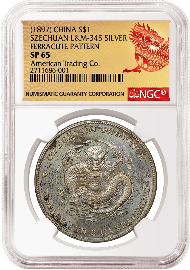 Nur drei komplette Sets von 1897 Ferracute Szechuan Proben überlebten und sind bekannt. Das Set, das von NGC auf der Messe der ANA World of Money gezeigt wird, war seit einigen Jahren im Besitz der American Trading Company, die mit Ferracute zusammengearbeitet hatte, um die Prägeausrüstung nach China zu liefern.