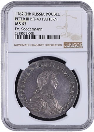 Der Star der SINCONA Auktion 42 war Lot 1074, ein 1762CNB Russland Rubel, mit der Einstufung NGC MS 62. Dieser Rubel erzielte 650.000 CHF oder das 13-fache seiner Vor-Auktions-Schätzung von 50.000 CHF. Die Münze, ein Peter III Bit-40-Pattern, stammt aus der Zeit in der Kaiser Peter III., im Jahre 1762, während sechs Monaten in Russland regierte. Wie die anderen Top-Stücke der Auktion ist auch diese Münze der beeindruckenden Sammlung von Leonid Soedermann zuzuschreiben.
